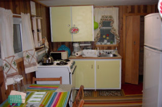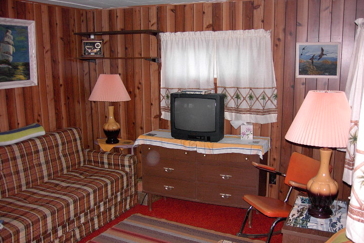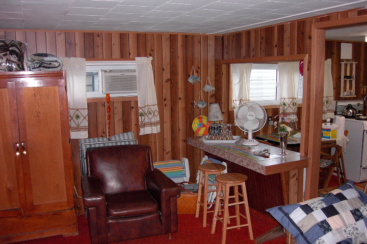 This homey cabin is a 460 sq. ft. gem with one bedroom, one double bed, one pullout couch, and several folding cots. Large livingroom, 2 piece bath, front deck with BBQ and storage shed. Satallite TV, DVD player.